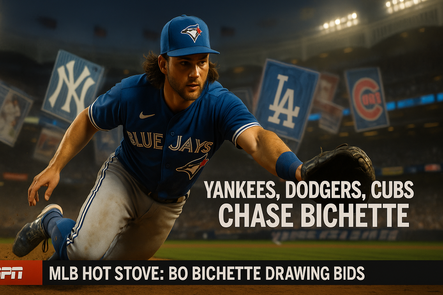 Dynamic illustration of Bo Bichette fielding at second base amid interest from Yankees, Dodgers, and Cubs for MLB news article.