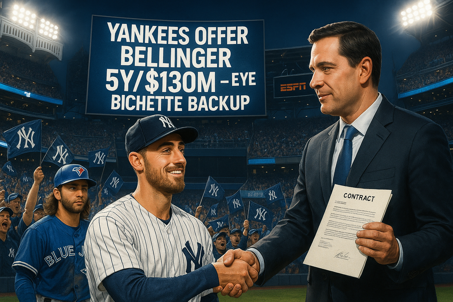 Illustration of Yankee Stadium scoreboard announcing the Yankees' $130M offer to re-sign Cody Bellinger, with Bo Bichette as backup plan.