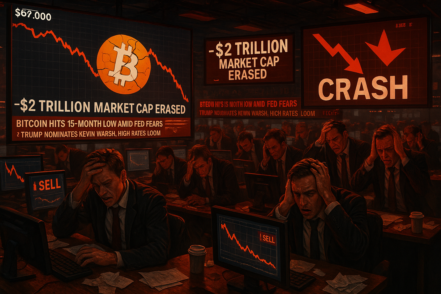 ビットコインは2月5日、一時$66,675まで下落し、その後$67,000前後で落ち着いた—2024年10月以来の最安値で、2025年10月6日のピーク$126,210.50から46%下落(Coinbaseデータ)。グローバル暗号資産市場は10月初旬の4.379兆ドル高値から2兆ドルを失い、過去1カ月だけで8,000億ドル消失(CoinGecko)。 nnこの加速は、トランプ氏が元Fed理事のケビン・ワーシュを指名したことがきっかけで、彼はタカ派と見なされている。Deutsche Bankのアナリストは、彼の姿勢が金利を高く維持し、投機資産を痛めると警告。「市場はタカを恐れる」とJulius Baerのマヌエル・ビリェガス・フランセスキ氏。「バランスシートの縮小は暗号資産に追い風を与えない」。 nn2025年1月以降のトランプ氏の親暗号資産措置—米国暗号資産覇権の執行命令や規制緩和—も潮目を変えられず。ビットコインは年初来23%安、12カ月で32%安;Etherは7%安の$1,973(年初来34%安)、SolanaとEthereumは2026年で約37%安。 nn米スポットビットコインETFは1月に30億ドルの流出、12月の20億ドル、11月の70億ドルに続き(Deutsche Bank)、機関投資家離れを示す。Coin BureauのNic Puckrin氏は「完全キャピチュレーション・モード」と呼び、数カ月続く可能性。 nn関連株も急落:Coinbase -9.1%、Robinhood -8.1%、Riot Platforms -10%。Strategy(旧MicroStrategy)は$76,000超で買った713,502 BTCを保有、現在478億ドル相当に対しコスト543億ドル。トランプ関連資産のWorld Liberty Financialトークンや$TRUMPミームコインも急落。 nnAbraのWilliam Barhydt氏ら強気派は混乱なければ反発を予想;Stifelら弱気派は$38,000を予測。今回の暴落はテック株や銀(-16.6%で$73.41)など広範な市場軟調と一致。