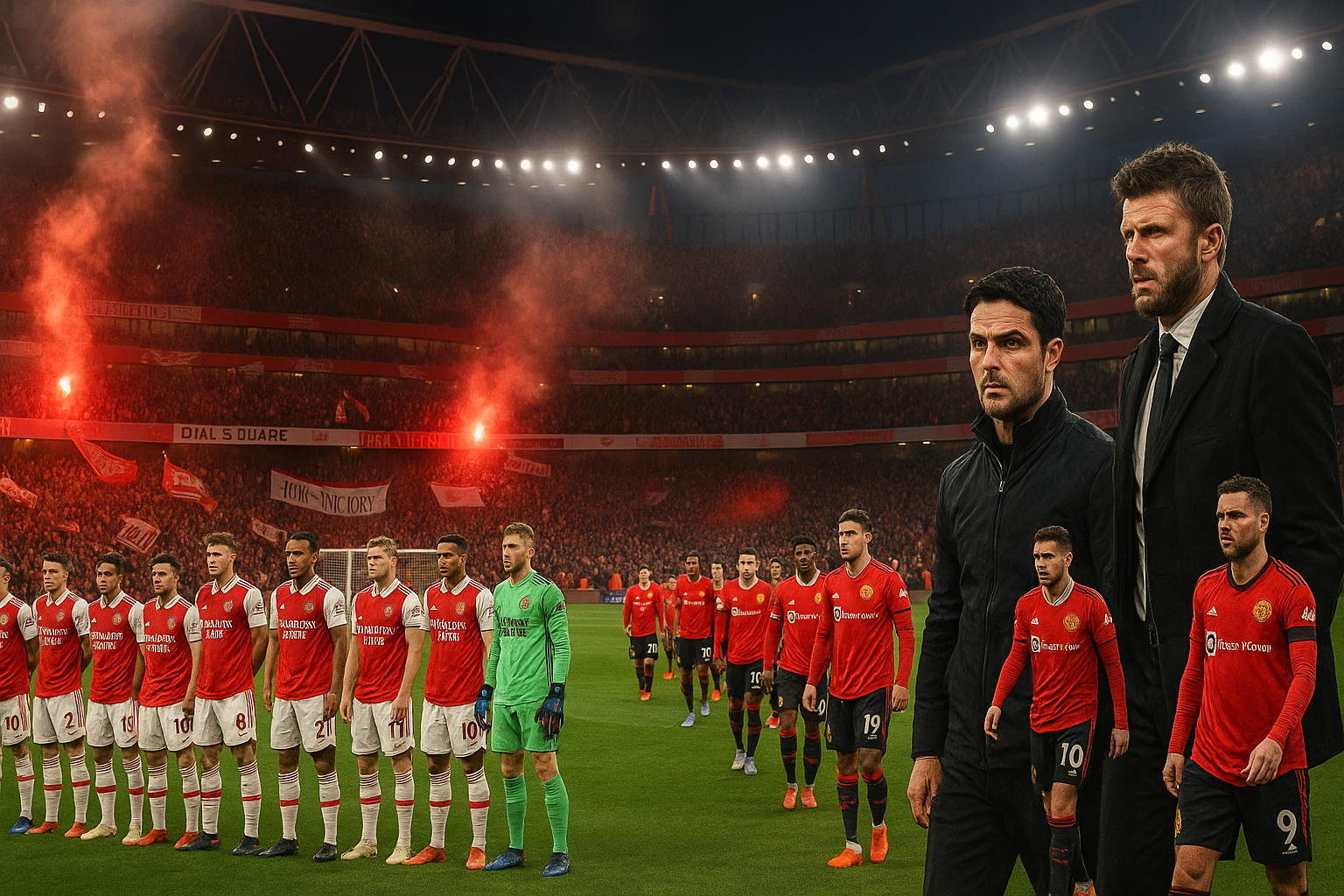Dynamic illustration of Arsenal hosting Manchester United at Emirates Stadium, fans and players gearing up for Premier League clash.