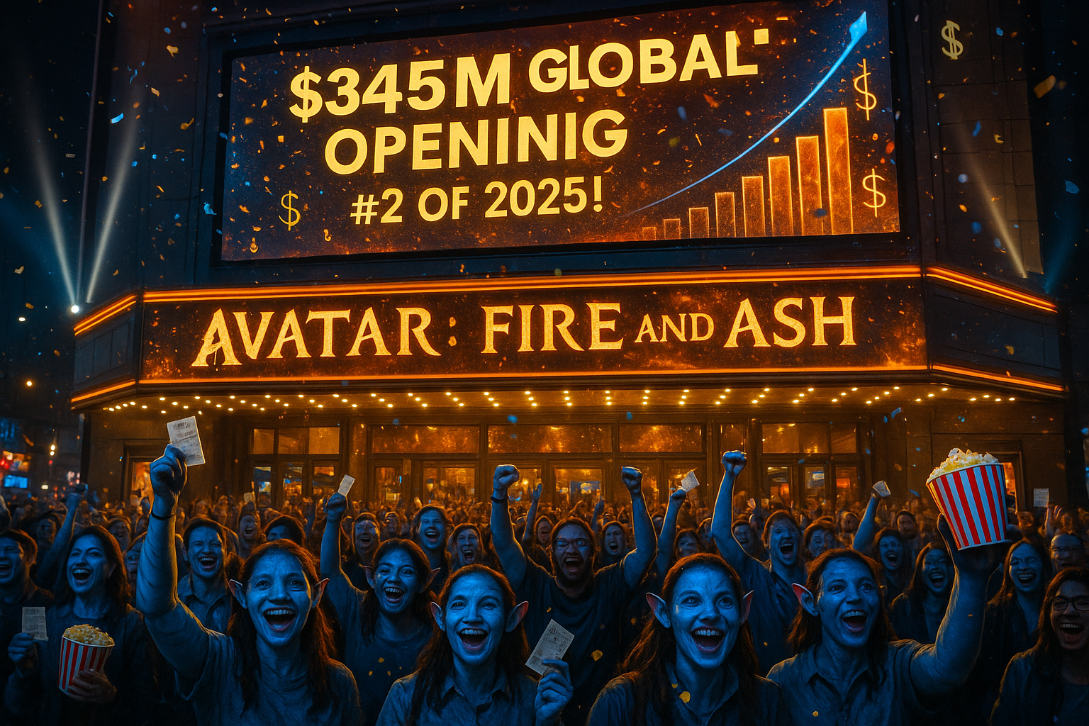 Vibrant photo of thrilled crowds outside a theater celebrating Avatar: Fire and Ash's record $345M global box office debut.