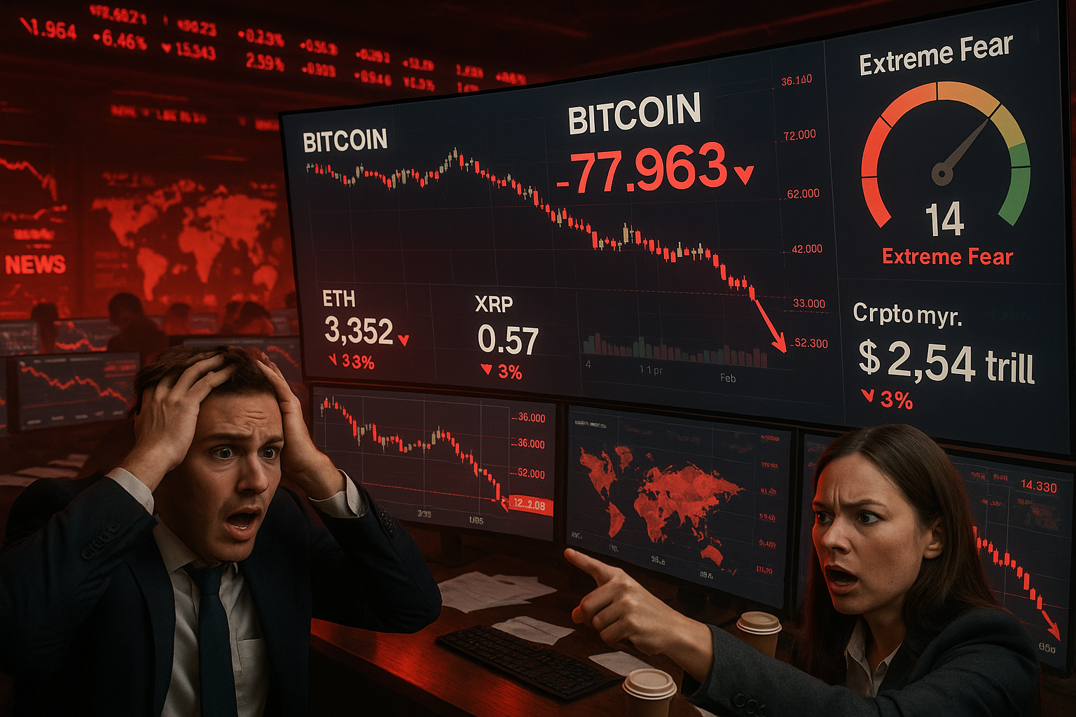 Bitcoin fell below $72,000 on February 4, 2026, marking its lowest level since November 2024 and dragging the total cryptocurrency market value down to $2.54 trillion, a 3% decline in 24 hours. Ethereum and XRP also slumped sharply, with the Fear and Greed Index hitting extreme fear levels around 14. The crash coincided with a stock market selloff and geopolitical tensions.