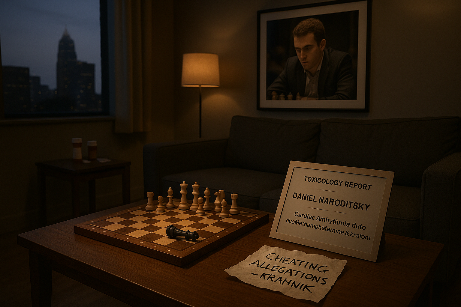 Illustrative photo of chess grandmaster Daniel Naroditsky's apartment scene symbolizing his accidental death from drug-related cardiac arrhythmia amid cheating stress.