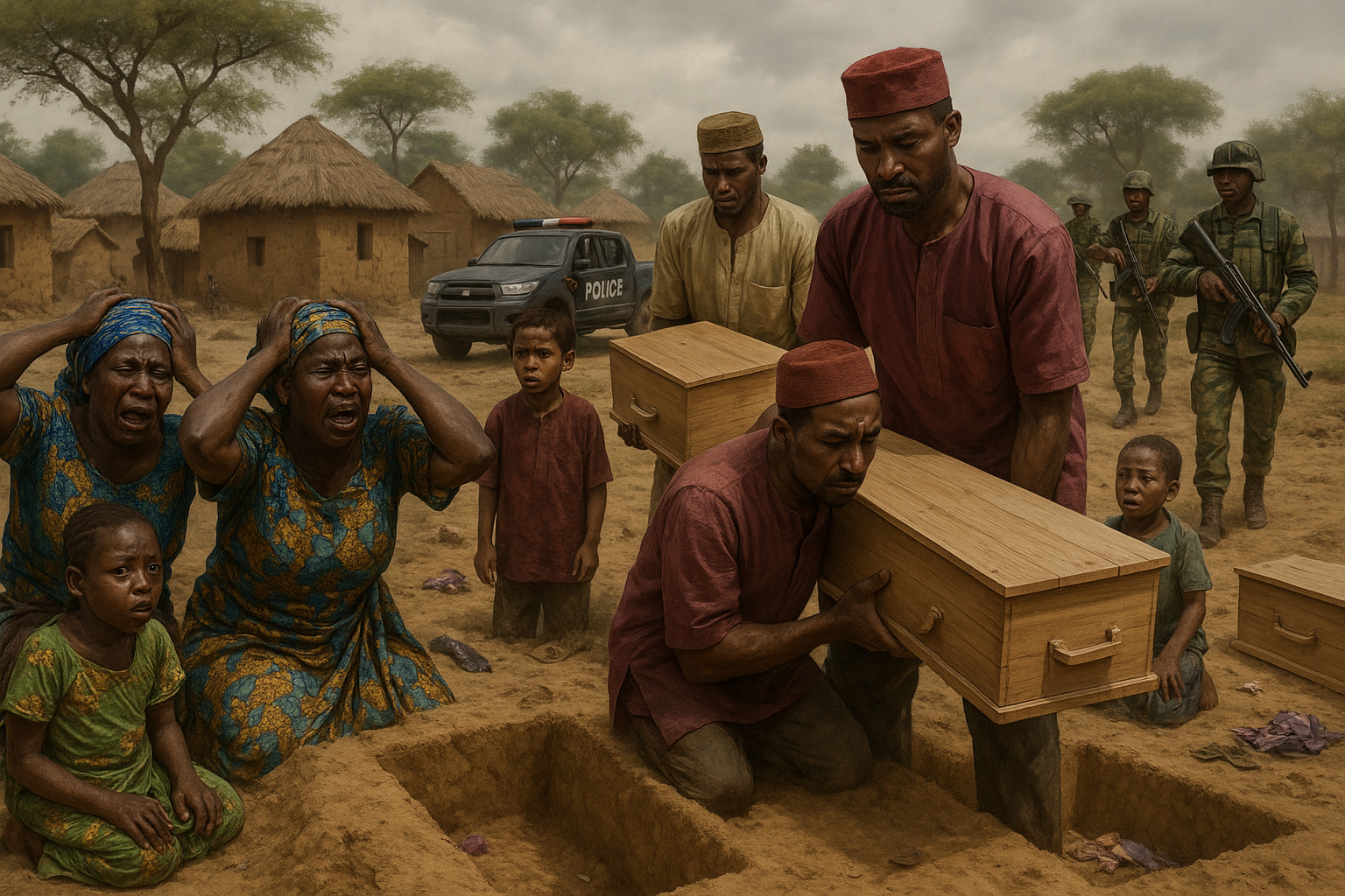 Villagers in Kaiama, Nigeria, mourn and bury victims of a terror attack as security forces provide protection amid ongoing regional threats.