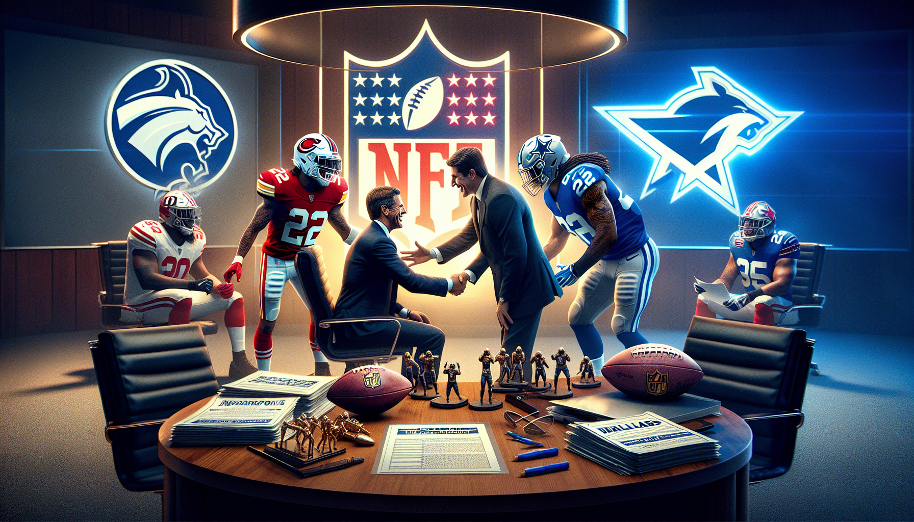 Realistic illustration of the New York Jets' 2025 NFL trade deadline blockbuster deals, showing traded players in new team jerseys and acquired draft picks.