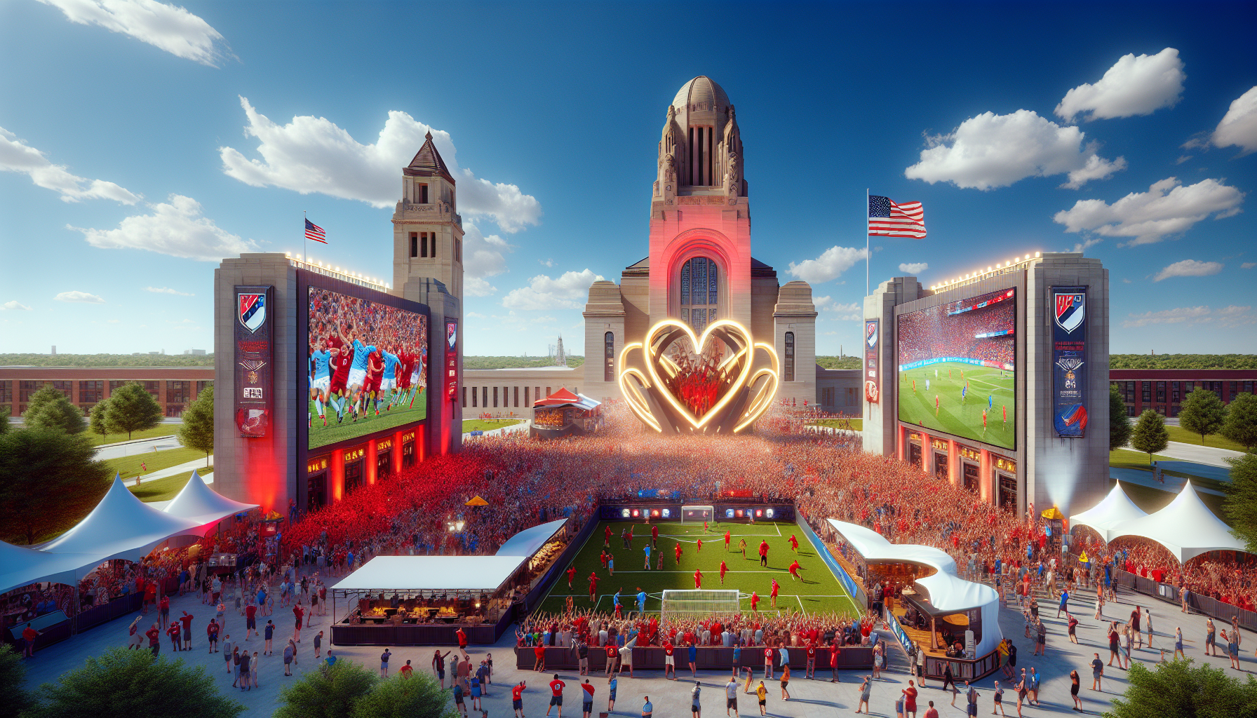 Vivid illustration of the planned 2026 World Cup Fan Fest in Kansas City, showing a heart-shaped entrance, large screens, live entertainment, and crowds at the National World War I Museum and Memorial.