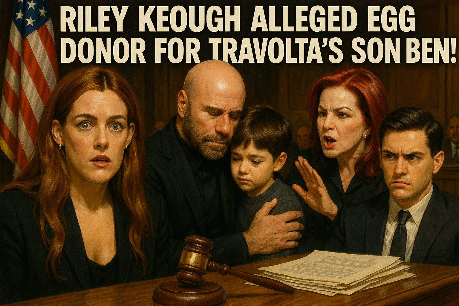 Dramatic courtroom illustration depicting lawsuit alleging Riley Keough provided eggs for John Travolta's son, with celebrity portraits and headlines.