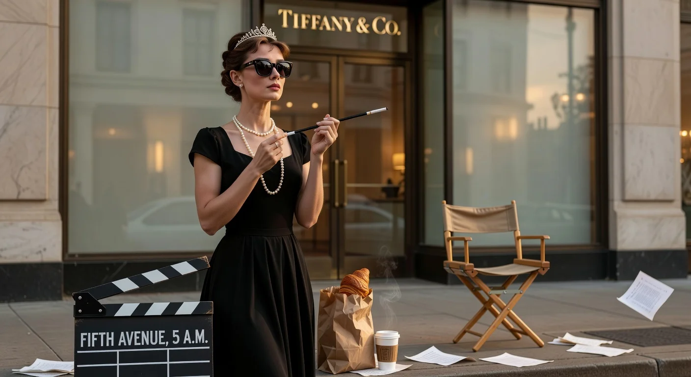 Lily Collins as Audrey Hepburn in a little black dress outside Tiffany's, with film production props, illustrating her casting in a new movie about Breakfast at Tiffany's.