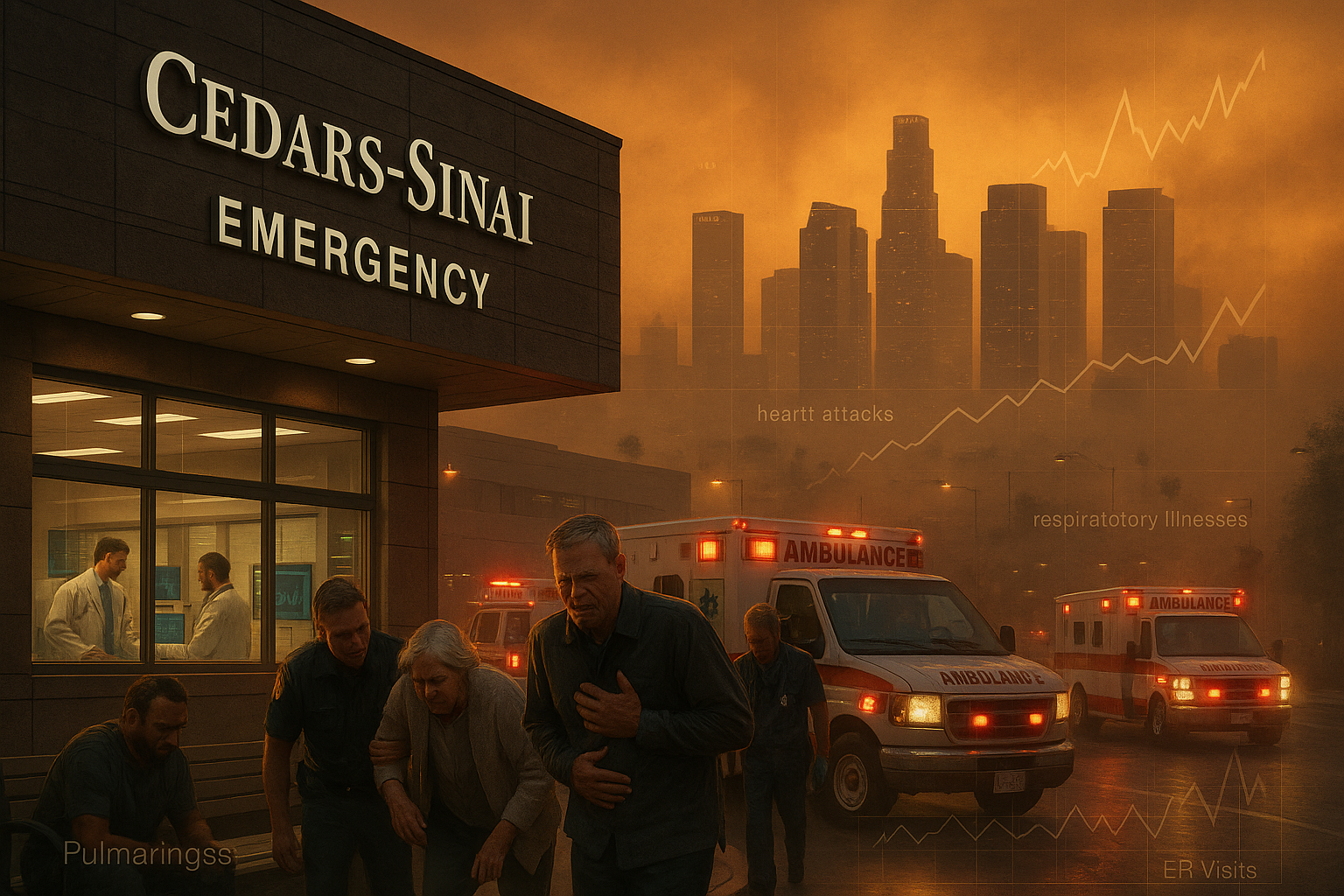 Los Angeles skyline under wildfire smoke with Cedars-Sinai ER overwhelmed by heart attack and respiratory patients, graphs showing visit spikes.