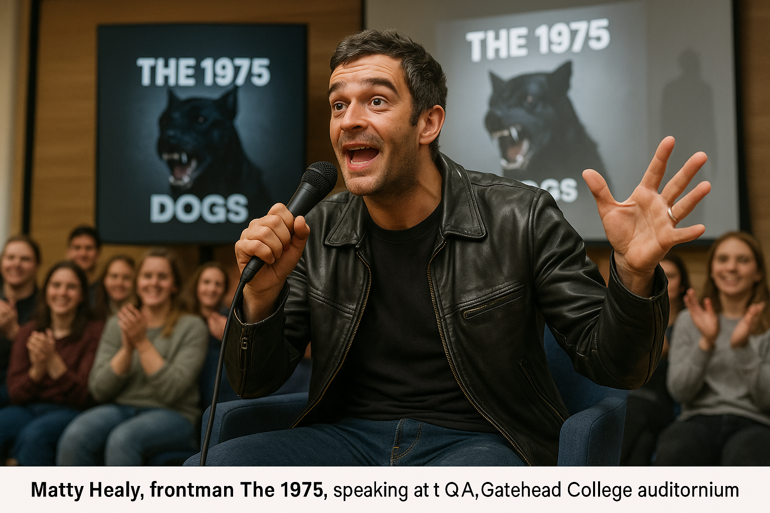 Matty Healy announces two new albums for The 1975 at Gateshead College Q&A, featuring 'DOGS' album hint.