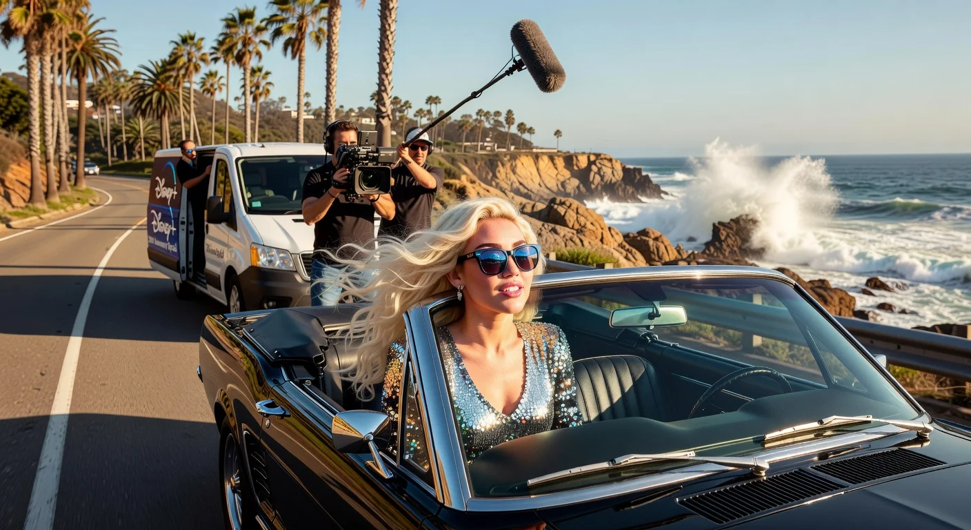 Miley Cyrus as Hannah Montana in platinum wig, driving black Mustang convertible filmed by crew on Malibu coast.
