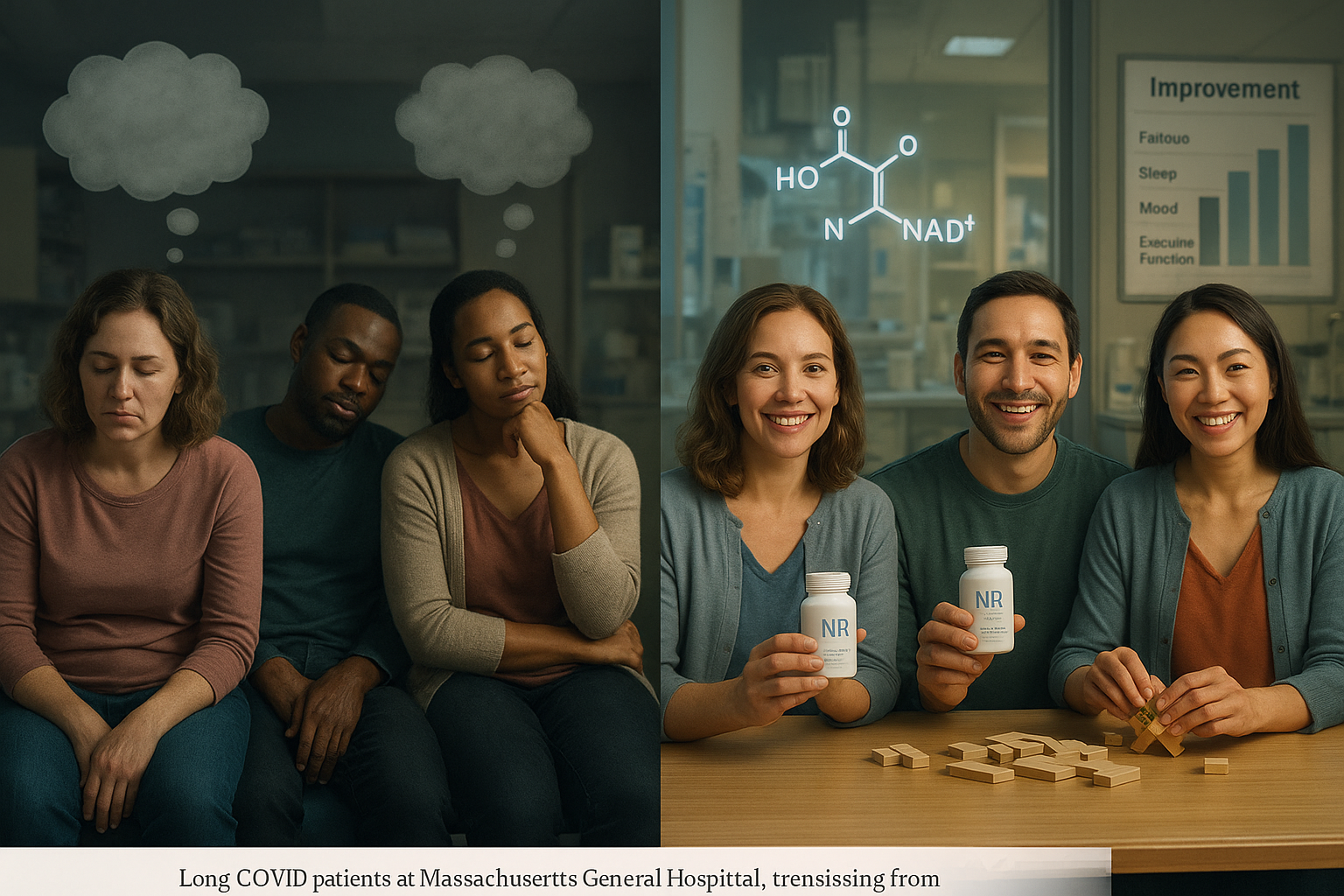 Realistic illustration of long COVID patients improving from fatigue and brain fog via NAD+ supplement trial at Massachusetts General Hospital.