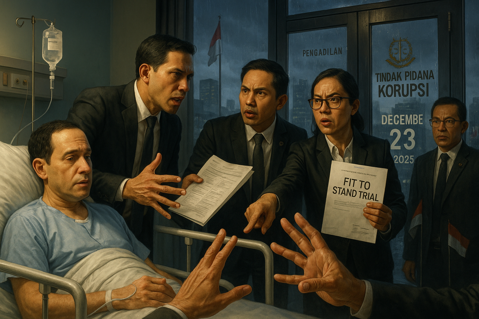 Illustration of dispute over Nadiem Makarim's health fitness for Chromebook corruption trial at Jakarta court, split view of hospital recovery vs. prosecutors' claims.
