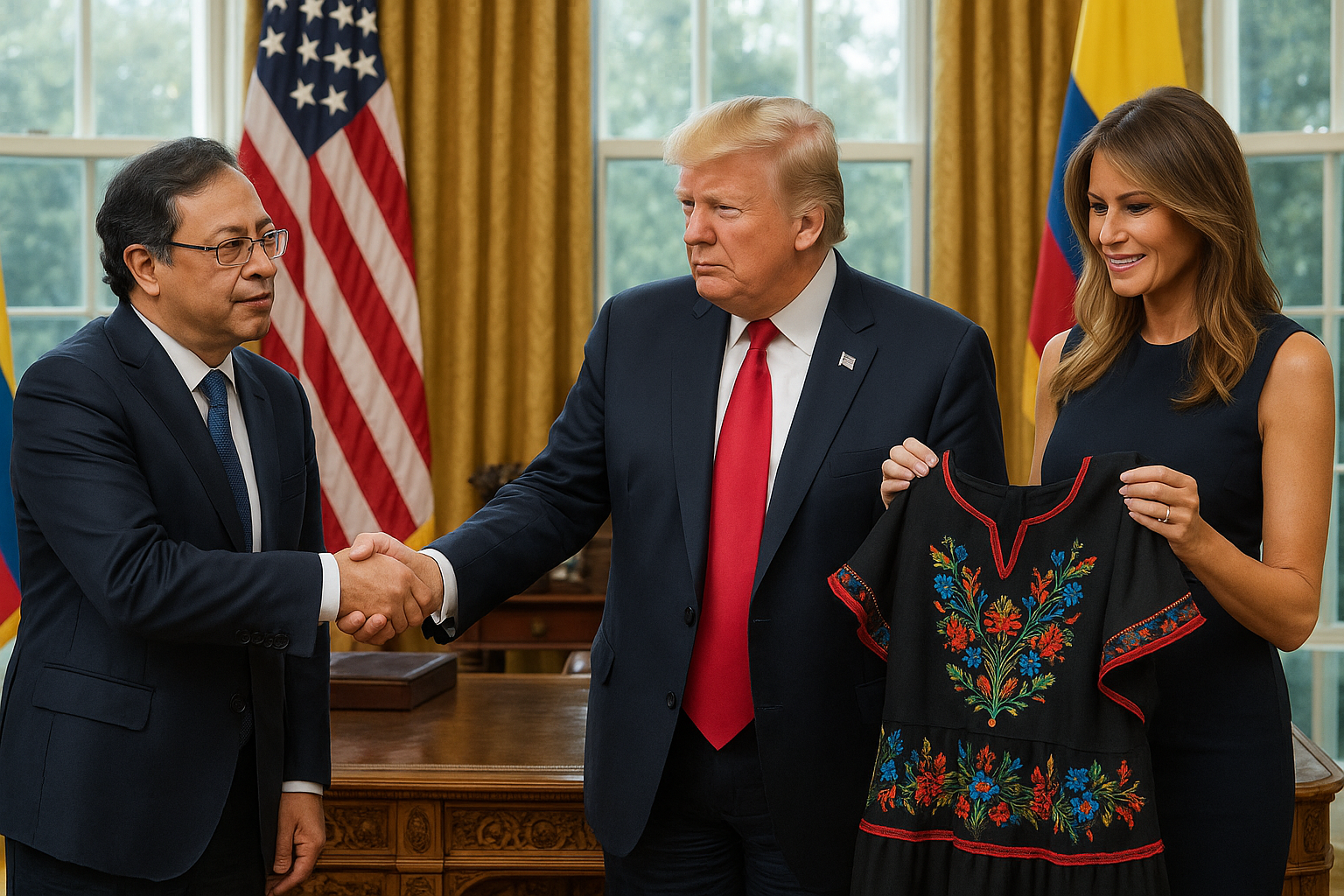 As gifts, Trump gave Petro a red cap with the slogan 'Make America Great Again,' which the Colombian president modified by adding an 'S' to read 'Make the Americas Great Again.' In return, Petro presented a dress designed by Flor Imbacuan Pantoja from Nariño, made by seven people over two months using pre-Columbian Guanga looms, involving 35 families. The garment, valued at 5 million pesos, symbolizes Nariño identity. 'This way we can show the world with all our love who we Nariñenses are to Colombia and the world,' said Imbacuan.