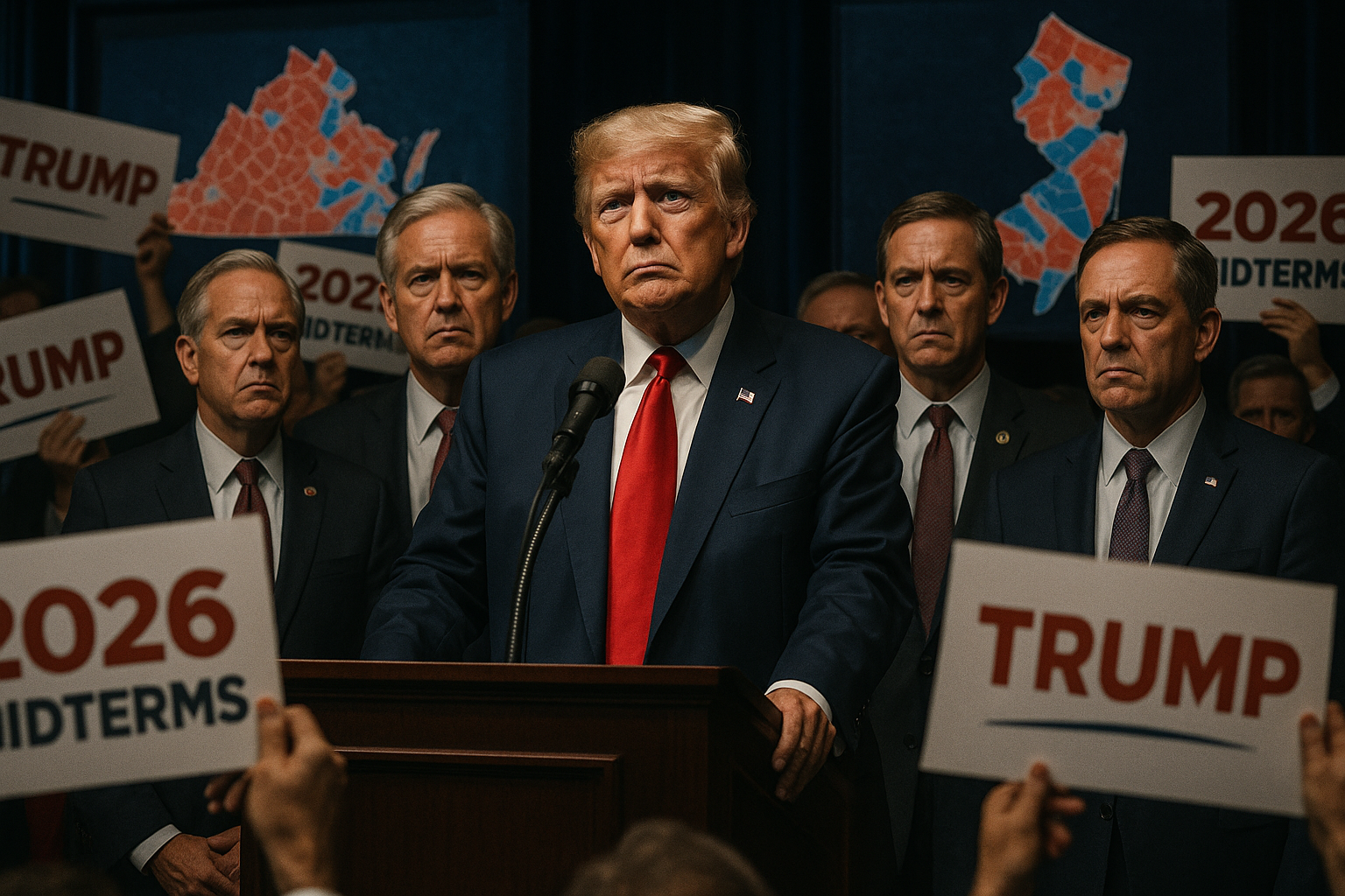 Former President Donald Trump at a podium with GOP officials, discussing 2026 midterm strategies amid maps of recent election defeats in Virginia and New Jersey.