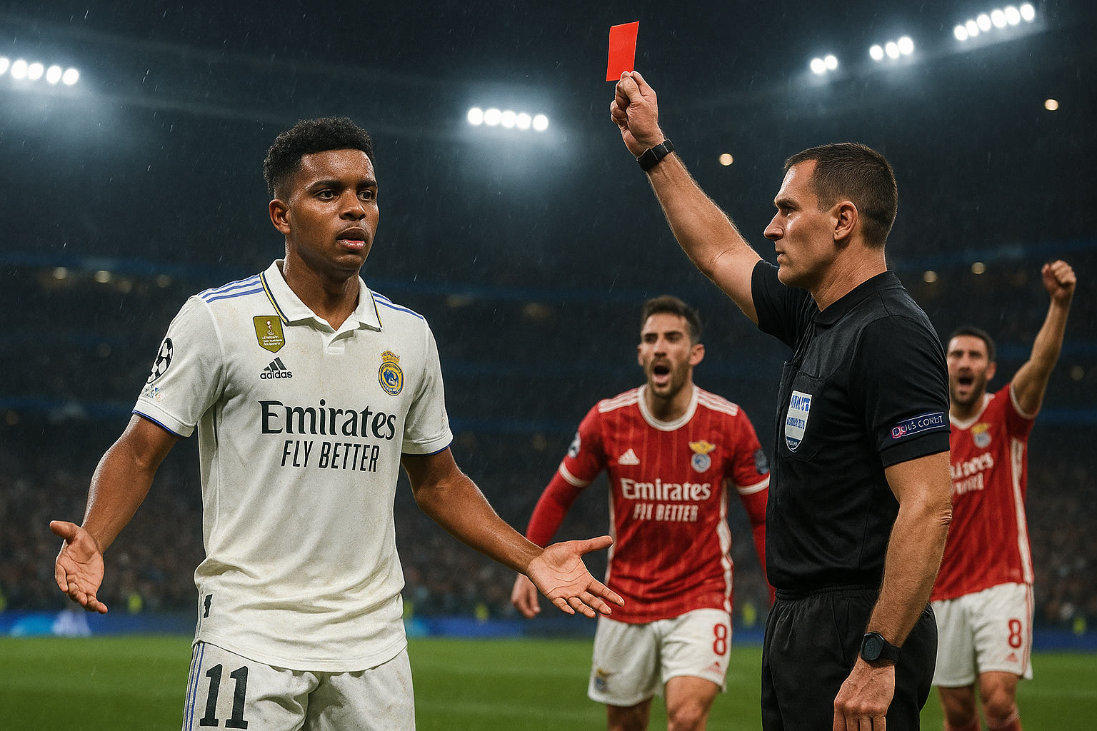 Rodrygo of Real Madrid receives a red card from the referee during a match against Benfica, illustrating his two-match Champions League playoff ban.