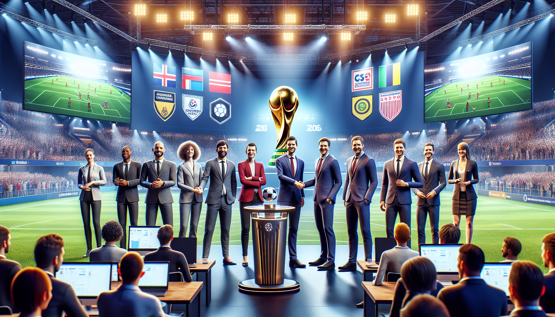 Executives from Sports Interactive and FIFA shaking hands at a press conference announcing the multi-year license for Football Manager 2026, featuring the World Cup trophy and game elements.