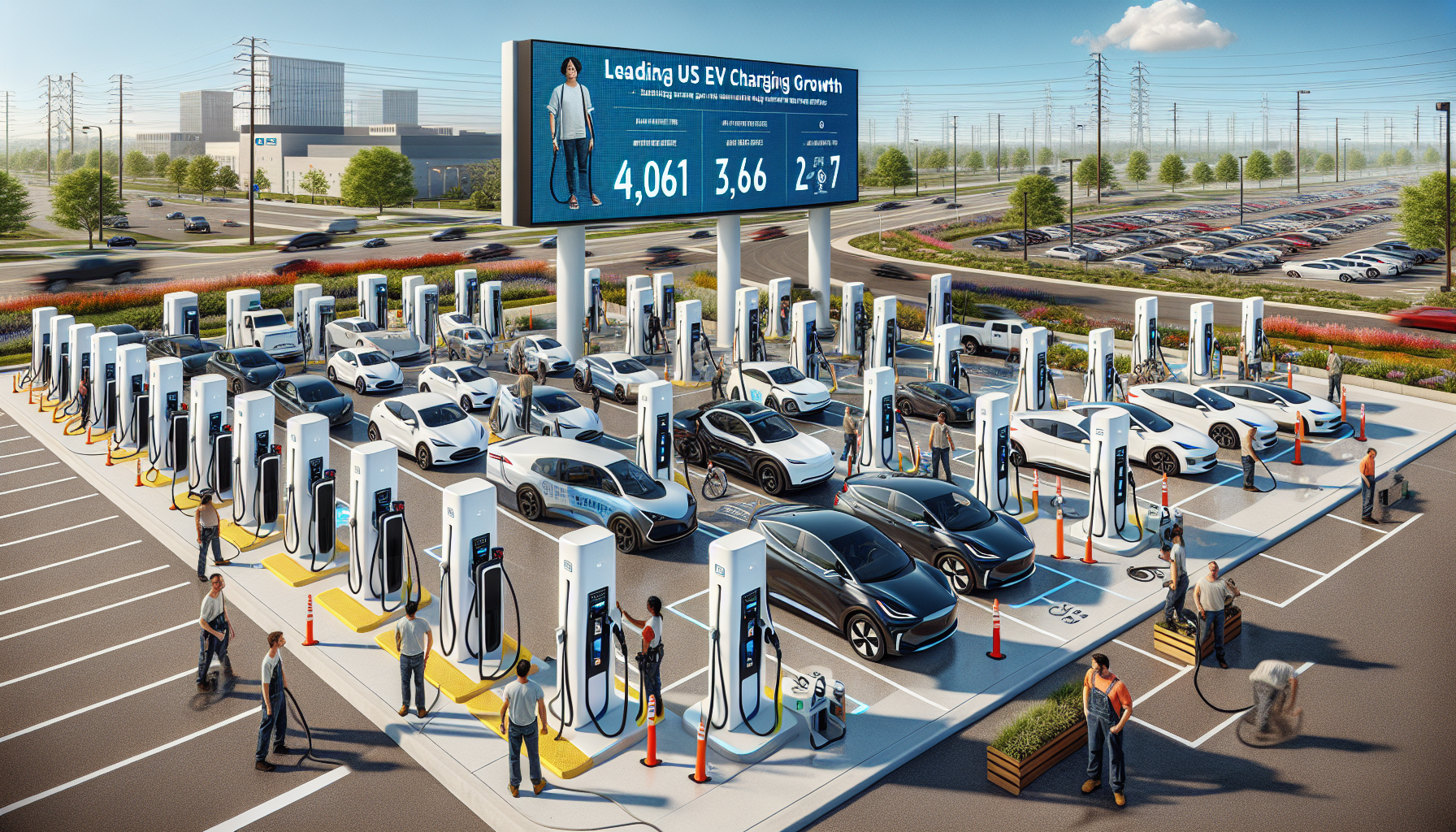 Vivid photo illustration of a Tesla Supercharger station depicting Tesla's dominance in adding US DC fast-charging ports in Q3 2025, with cars charging and growth stats displayed.