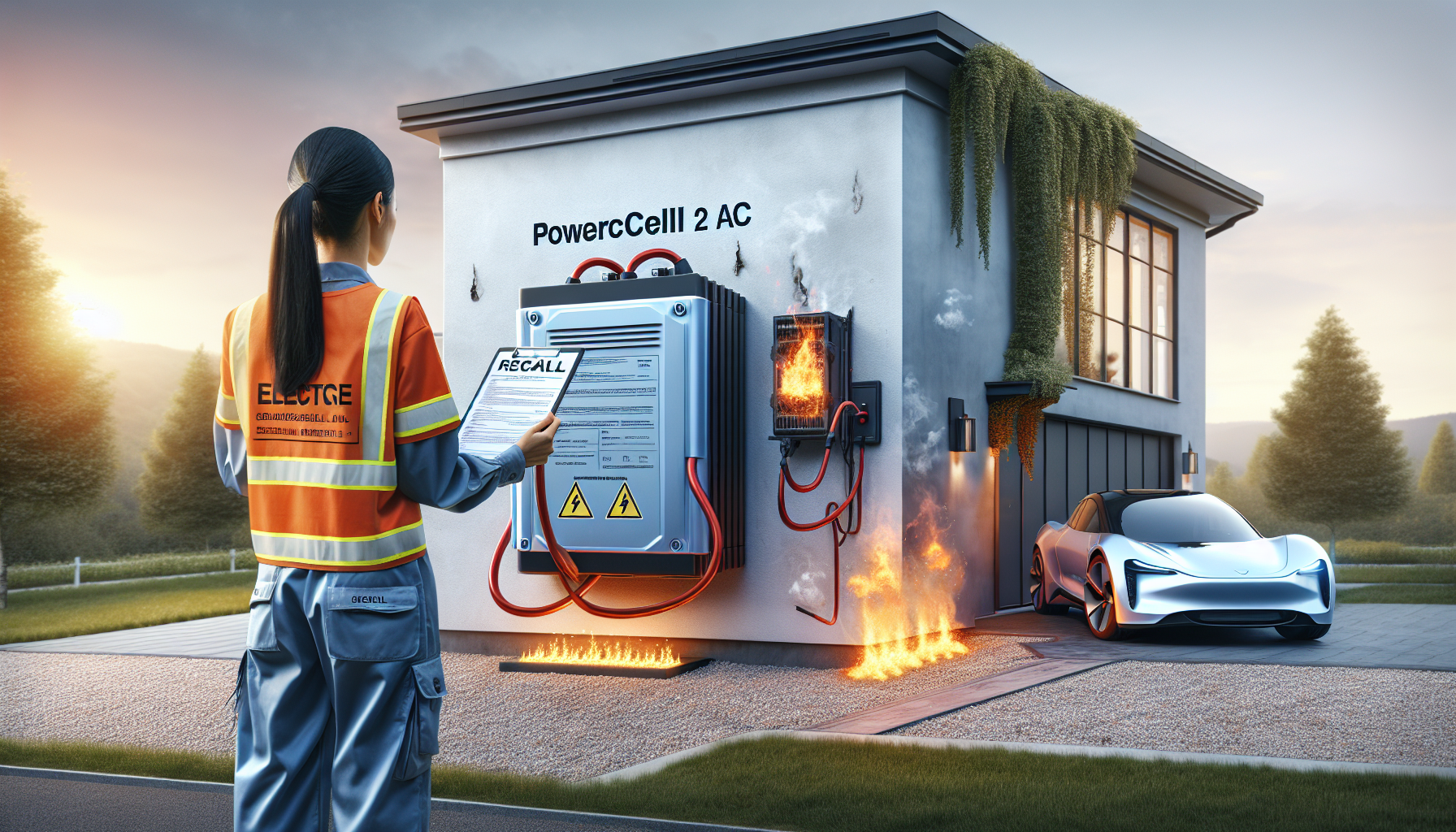Realistic photo illustration of a Tesla Powerwall 2 battery overheating with smoke and flames, alongside a recall notice, for news article on fire hazard recall.