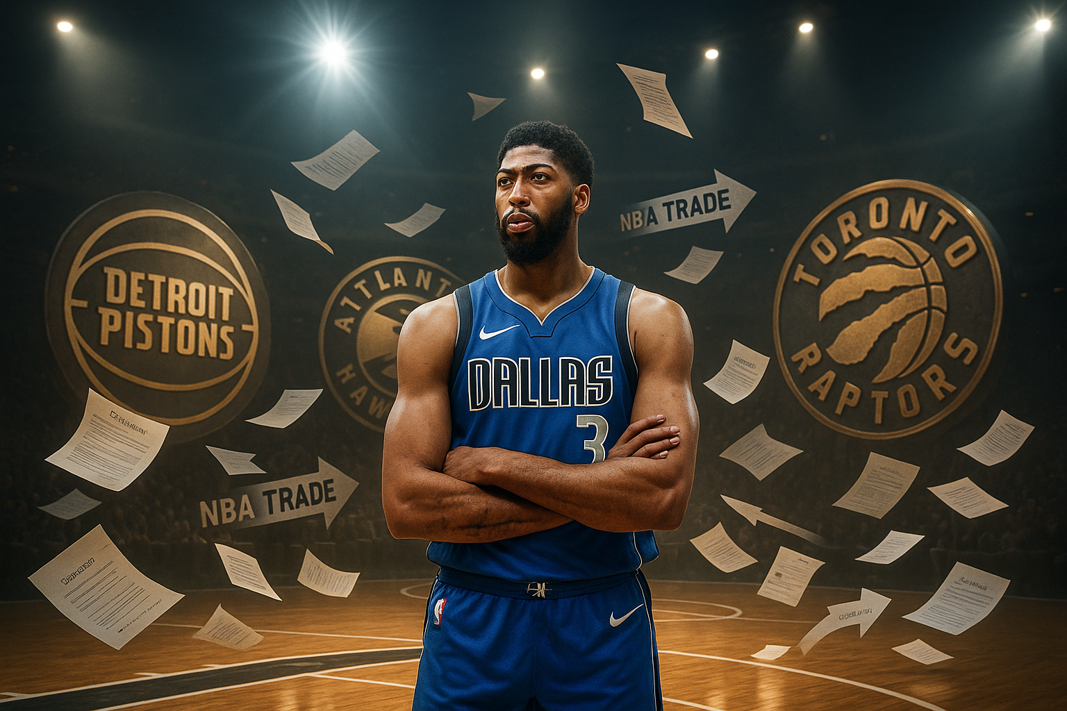 Illustration depicting Anthony Davis amid trade rumors, pursued by Pistons, Hawks, and Raptors logos on Mavericks court.