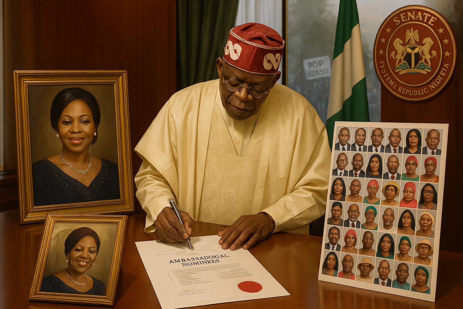 President Tinubu presents list of 32 ambassador nominees, including Florence Ajimobi, to Senate amid opposition criticism.