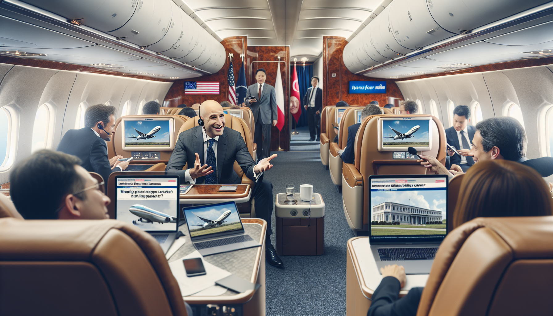 President Trump aboard Air Force One discussing a potential third term, with reporters and airplane interior in the background.