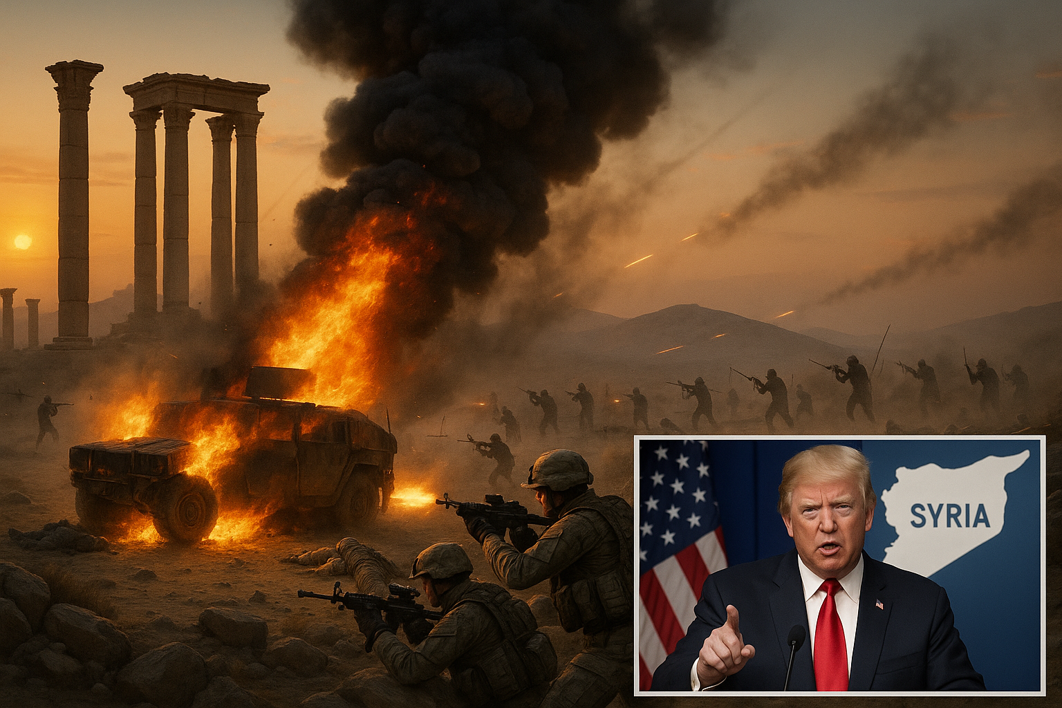 Illustration depicting ISIS ambush on US forces near Palmyra, Syria, killing three Americans, with inset of President Trump vowing retaliation.
