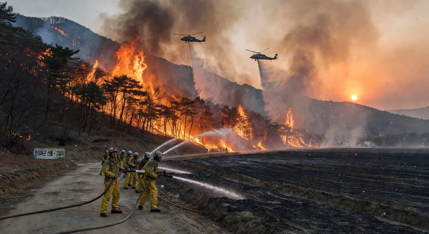 한국 남부 함양군에서 발생한 산불이 3일째 이어지며 소방당국과 산림청이 당일 내 진화를 위해 분주히 움직이고 있다. 산불은 토요일 오후 9시경 발생해 190헥타르를 태웠으며, 월요일 오전 5시 기준 진화율은 32%에 불과하다.