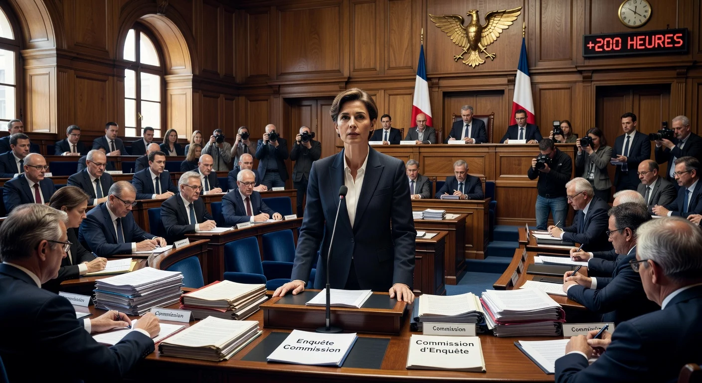 Delphine Ernotte testifying at the concluding hearing of France's National Assembly inquiry commission on public broadcasting, surrounded by deputies and documents.
