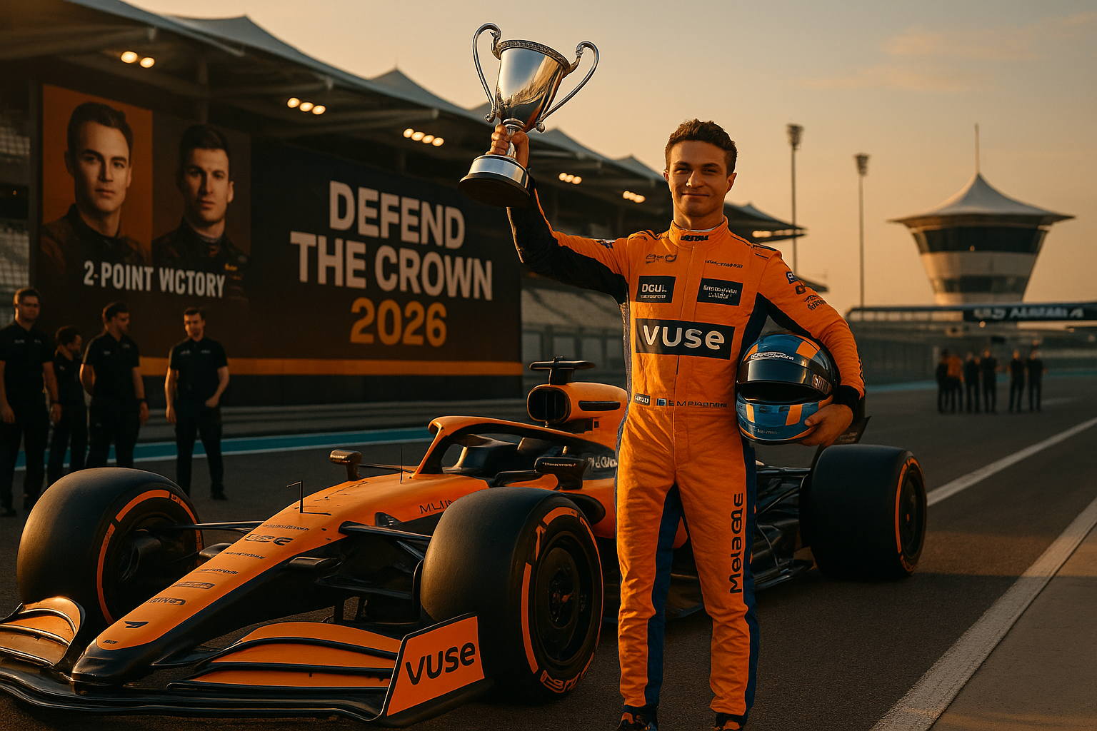 Lando Norris, 2025 F1 champion, poses confidently with trophy at McLaren 2026 launch, reflecting on title defense.