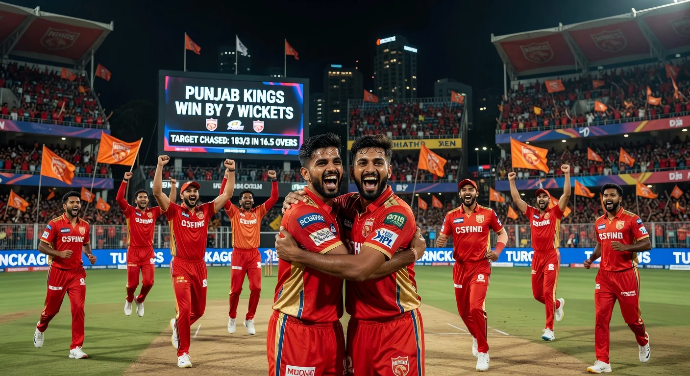 Punjab Kings defeated Mumbai Indians by seven wickets at Wankhede Stadium, reclaiming the top spot in the IPL 2026 points table. Prabhsimran Singh remained unbeaten on 80 off 39 balls, while Shreyas Iyer scored 66 off 35. Mumbai Indians sit second from bottom with two points from five matches.