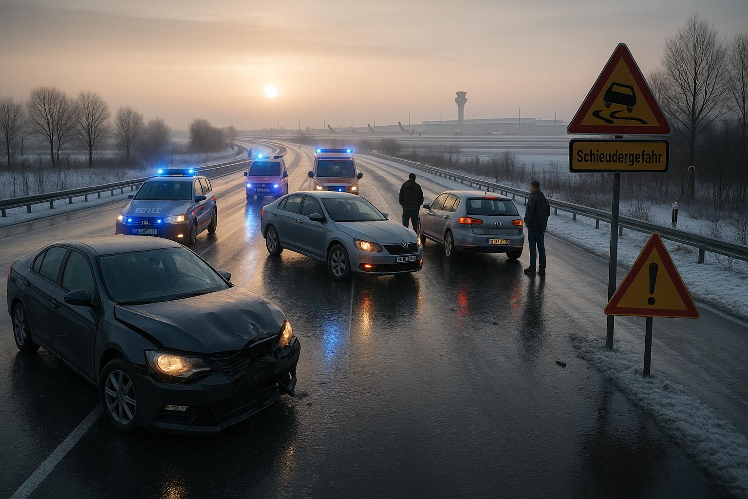 Illustration of black ice causing car accidents on A10 highway in Brandenburg, with Berlin Brandenburg Airport suspended in the background.