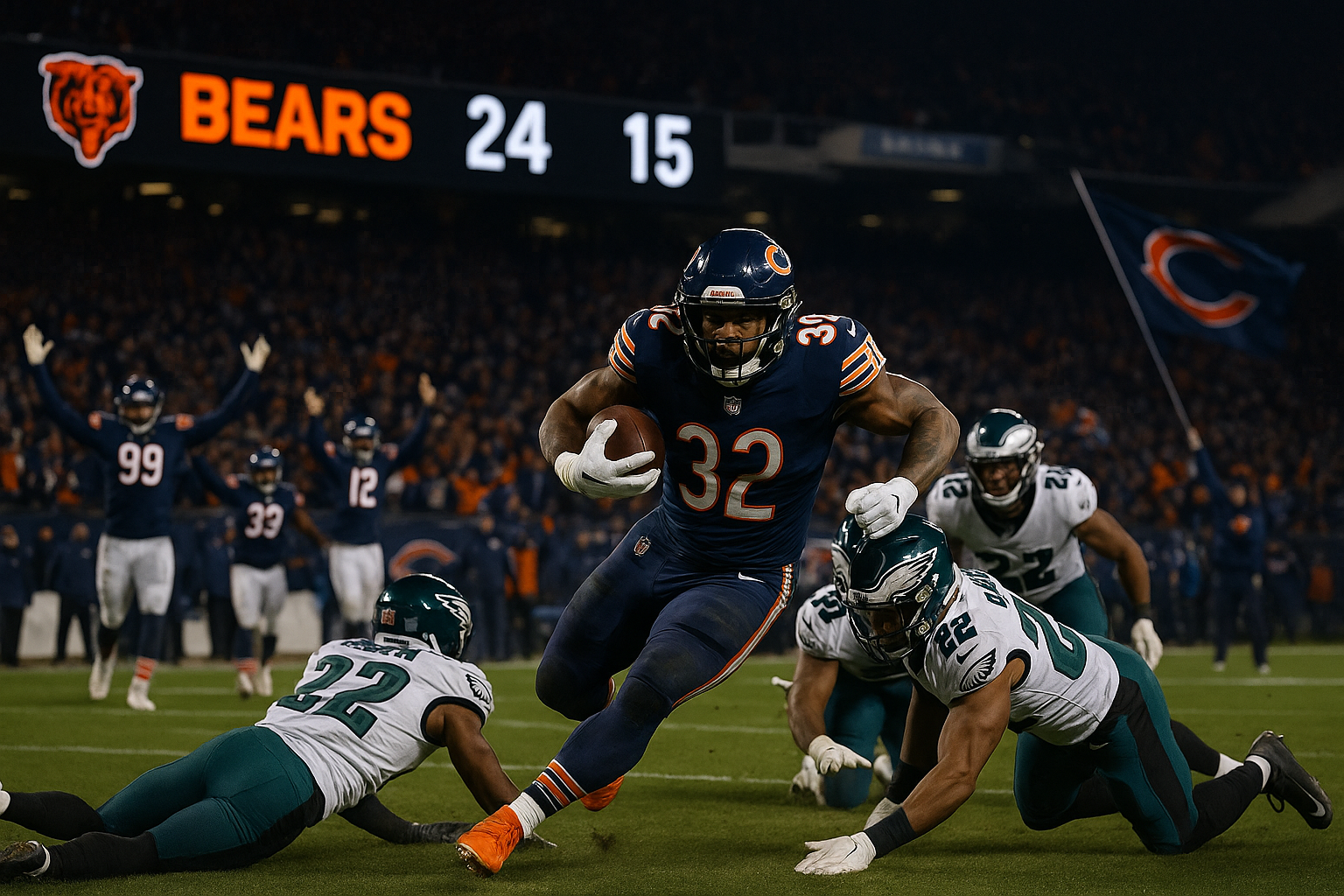 Os Chicago Bears garantiram uma vitória por 24-15 sobre os Philadelphia Eagles na Black Friday, marcando sua quinta vitória consecutiva e entregando aos campeões defensores do Super Bowl sua segunda derrota seguida. O ataque correndo de Chicago dominou com 281 jardas, enquanto sua defesa forçou turnovers chave para selar o jogo.