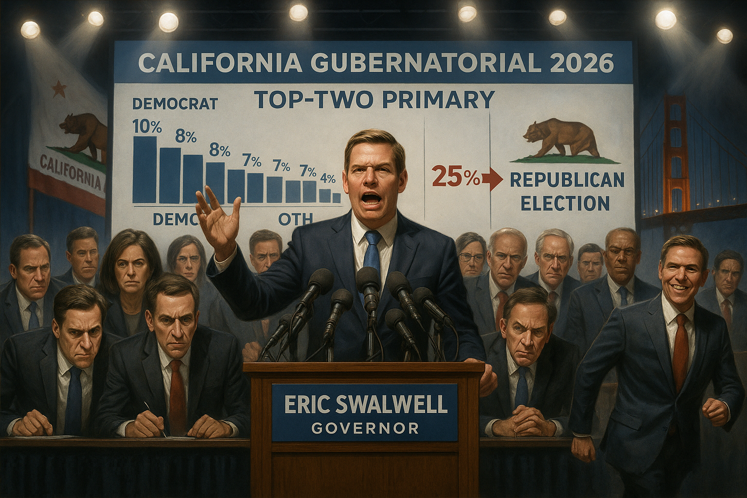 O representante Eric Swalwell juntou-se a uma lista crescente de democratas disputando a nomeação para governador da Califórnia em 2026, adicionando outro concorrente de alto perfil a um campo lotado sob o sistema de primárias top-two do estado. Estrategistas dizem que o influxo de candidatos democratas pode fragmentar o voto e aumentar as chances de um republicano avançar para a eleição geral, mesmo enquanto Swalwell lança sua candidatura em meio a uma referência federal por suposta fraude hipotecária e fiscal ligada a uma casa em Washington, D.C.