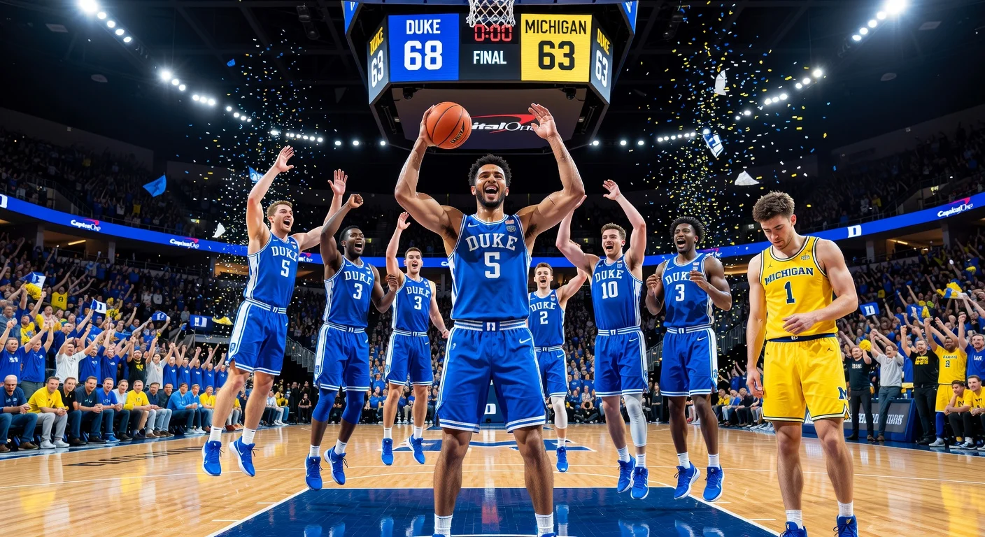 Duke Blue Devils celebrate narrow 68-63 thriller win over Michigan Wolverines, with Cameron Boozer leading the charge in intense arena action.