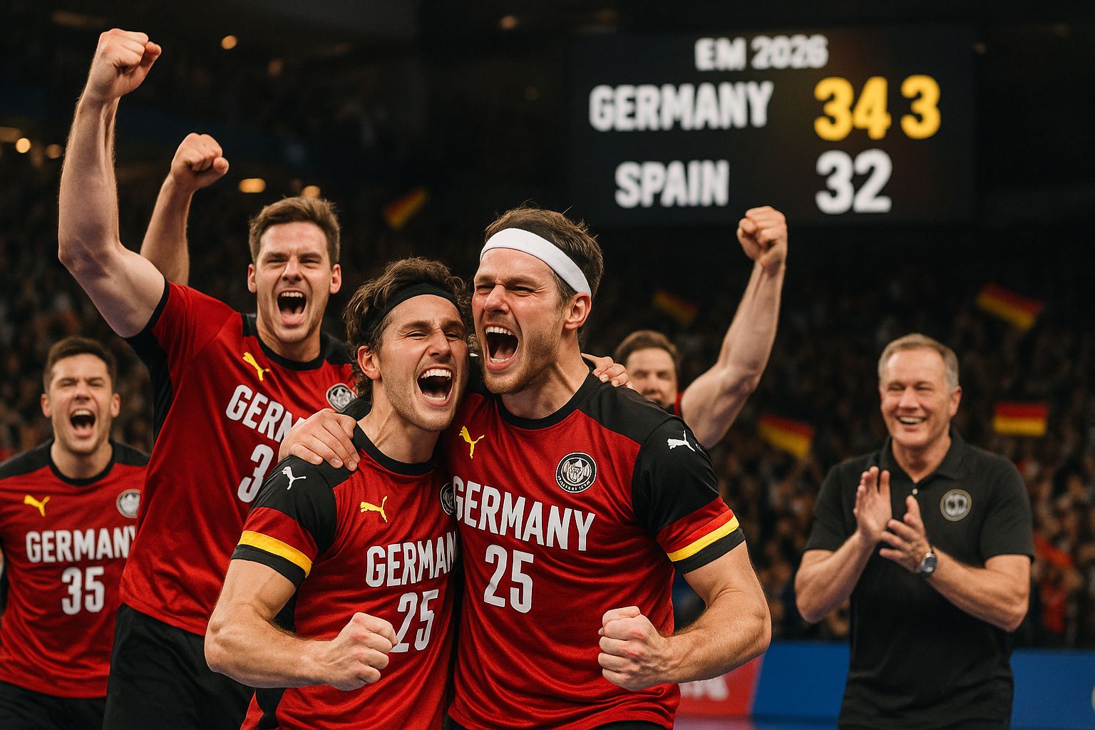 German handball team celebrates narrow 34:32 win over Spain at EM 2026, advancing as group winners.