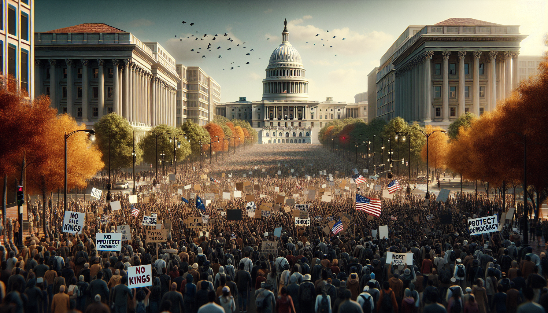 Manifestantes em todo os EUA participaram da segunda onda de protestos 'No Kings' em 18 de outubro de 2025, direcionados à administração do presidente Donald Trump em meio a um fechamento do governo de 18 dias. Organizadores relataram mais de 2.600 eventos em todos os 50 estados, esperando que a participação supere os 5 milhões das manifestações de junho. Republicanos criticaram os eventos como reuniões que 'odeiam a América', enquanto manifestantes enfatizaram o exercício pacífico dos direitos da Primeira Emenda.