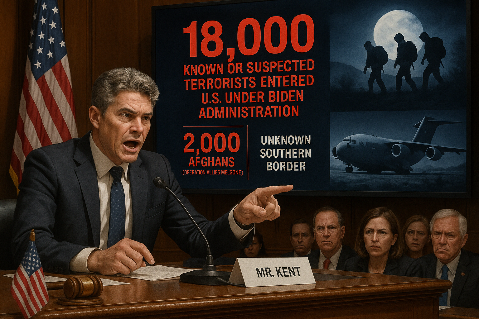 Joe Kent, diretor do Centro Nacional de Contraterrorismo, disse ao Comitê de Segurança Interna da Câmara que cerca de 18.000 pessoas que ele descreveu como terroristas conhecidos ou suspeitos entraram nos Estados Unidos durante a administração Biden, incluindo cerca de 2.000 afegãos admitidos sob a Operação Allies Welcome após a retirada dos EUA do Afeganistão. Kent disse que a estimativa não inclui um número desconhecido de pessoas que cruzaram a fronteira sul ilegalmente e criticou o que chamou de verificação inadequada, citando um recente tiroteio mortal em Washington, D.C.