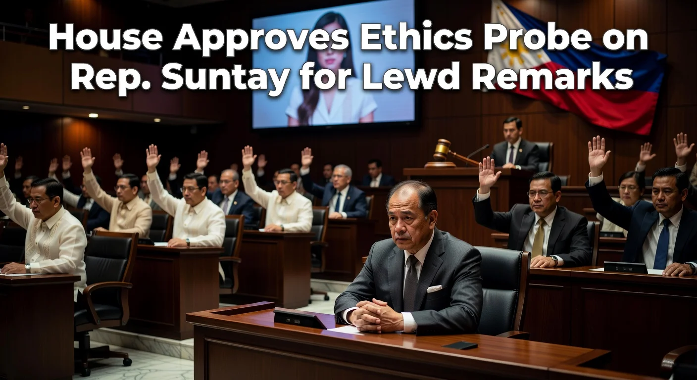 The House of Representatives has approved a formal ethics probe into Quezon City 4th District Rep. Bong Suntay following his lewd remarks about actress Anne Curtis during a justice committee hearing on impeachment complaints against Vice President Sara Duterte. Lawmakers condemned the comments as degrading to women and in violation of the Bawal Bastos law prohibiting catcalling and sexual harassment.