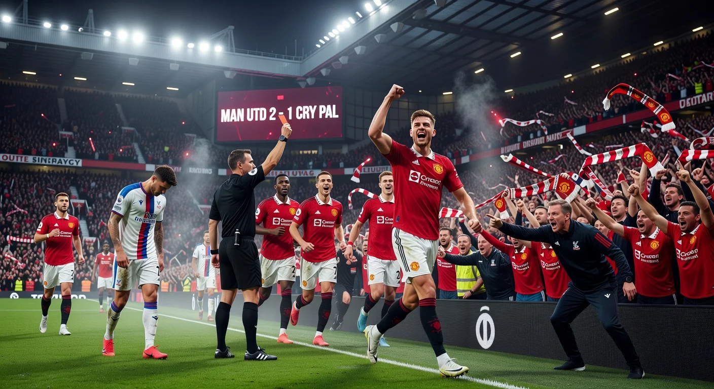 Dramatic illustration of Manchester United's 2-1 win over Crystal Palace at Old Trafford, highlighting the controversial red card and winning goal celebration.
