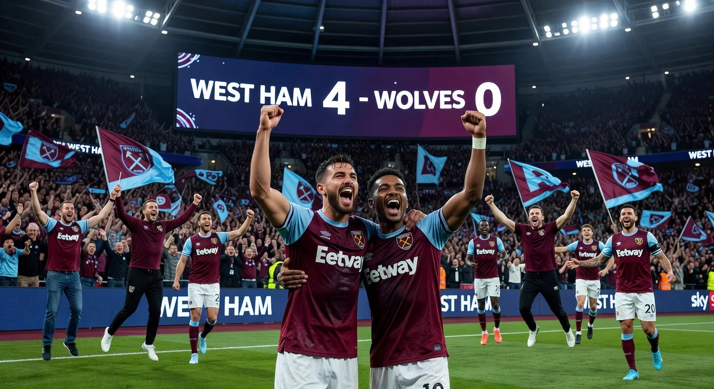 West Ham United secured a 4-0 victory over bottom-placed Wolverhampton Wanderers at the London Stadium, moving out of the Premier League relegation zone at Tottenham's expense. Konstantinos Mavropanos and Taty Castellanos each scored twice in the win. The result leaves West Ham two points clear of Spurs.