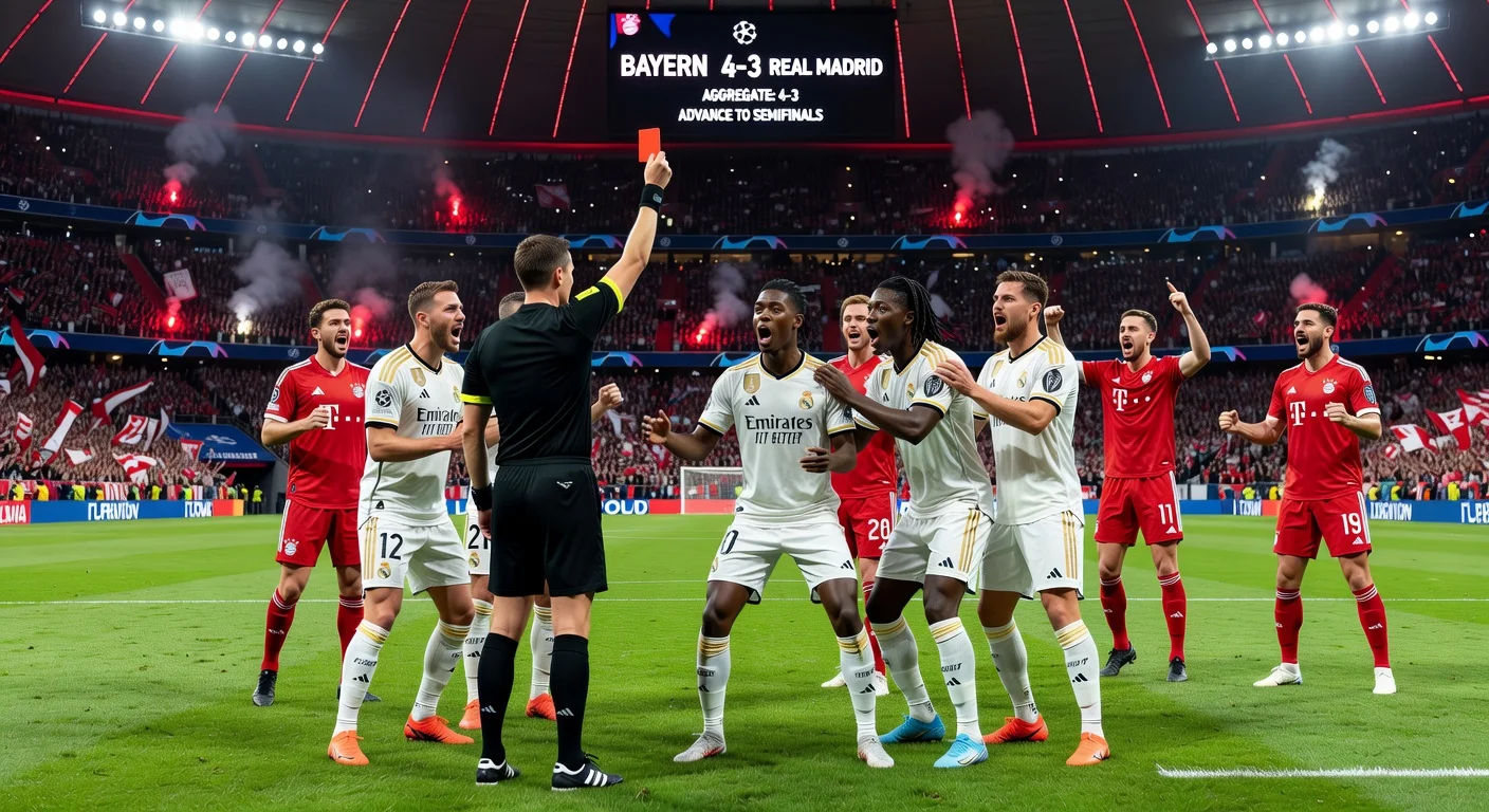 Bayern München besegrade Real Madrid med 4–3 i Champions League-kvartsfinalens returmöte på Allianz Arena – och avancerade vidare med 6–4 totalt efter segern med 2–1 i det första mötet – för att nå semifinalen mot PSG. Ett omdiskuterat andra gult kort till Eduardo Camavinga i den 86:e minuten vände matchen, där Luis Díaz och Michael Olise gjorde sena avgörande mål. Reals tränare Álvaro Arbeloa kritiserade domaren Slavko Vinčićs "oförklarliga" beslut.