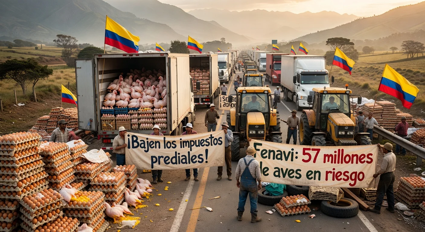Protests against property tax valuation hikes have blocked roads in Santander and Norte de Santander, stockpiling over 10 million eggs and 1,500 tons of chicken. The National Poultry Federation (Fenavi) reports canceled exports and risk to 57 million birds due to feed shortages. President Gustavo Petro urged mayors to lower property tax rates to end the blockades.
