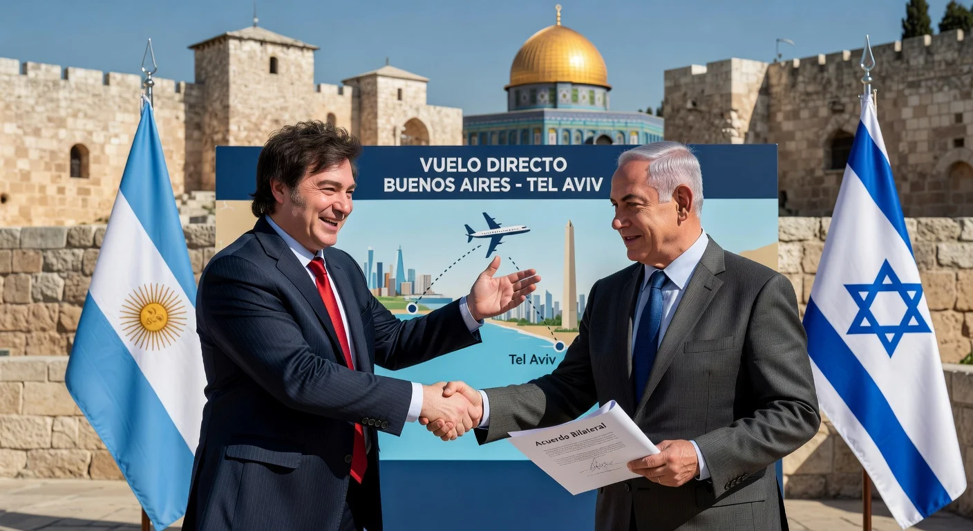 Argentine President Javier Milei announces new direct Buenos Aires-Tel Aviv flight with Israeli PM Benjamin Netanyahu in Jerusalem.