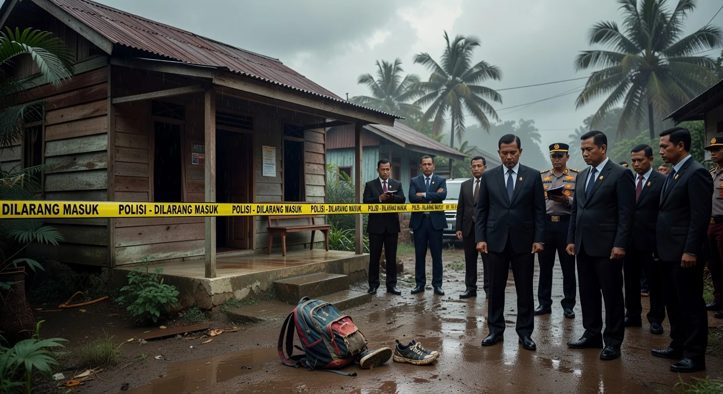 Somber photorealistic illustration of police and officials investigating a child's death at a rural Indonesian home, with abandoned school items evoking tragedy.