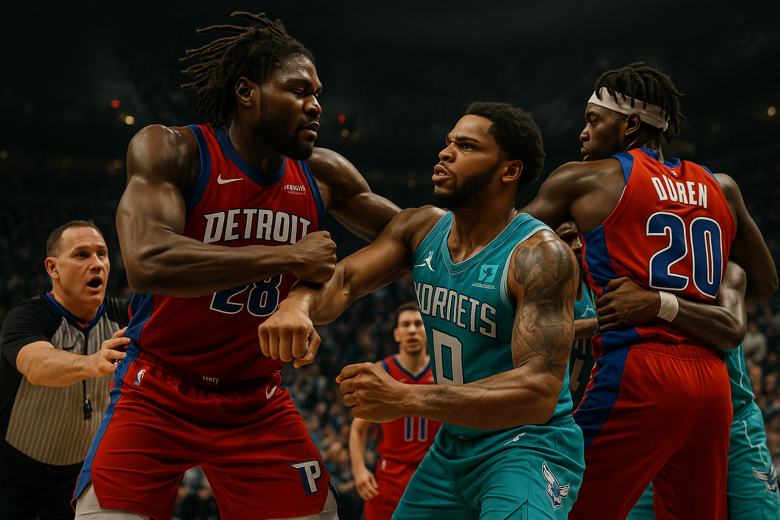 Dramatic illustration of a brawl between Pistons' Jalen Duren and Hornets' Moussa Diabate during NBA game, with referees intervening and ejections, capturing the heated third-quarter confrontation.