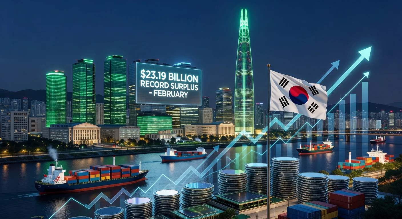 South Korea recorded its largest-ever monthly current account surplus of $23.19 billion in February, according to Bank of Korea data. The figure was driven by a semiconductor upcycle and robust exports. It sharply exceeded January's $13.26 billion and surpassed the previous record of $18.7 billion set in December 2025.