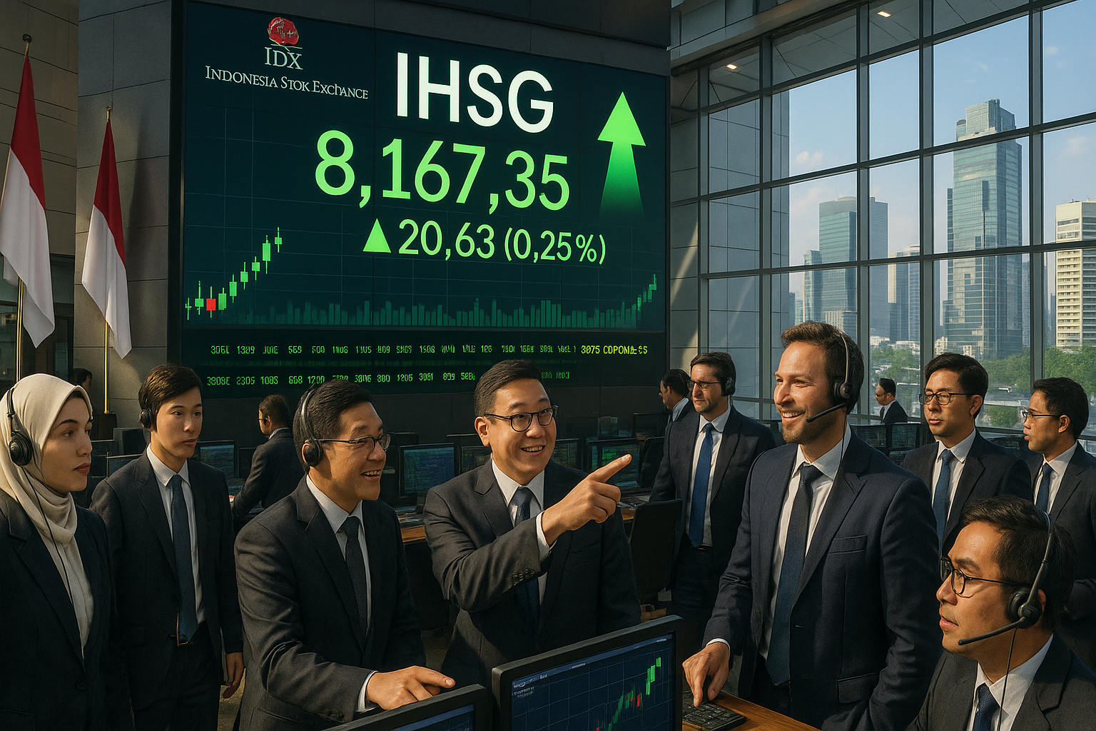 Illustration of Indonesia's IHSG index opening up 0.25% at 8,167.35 on the IDX trading floor, with traders monitoring green-gaining screens amid GDP anticipation.