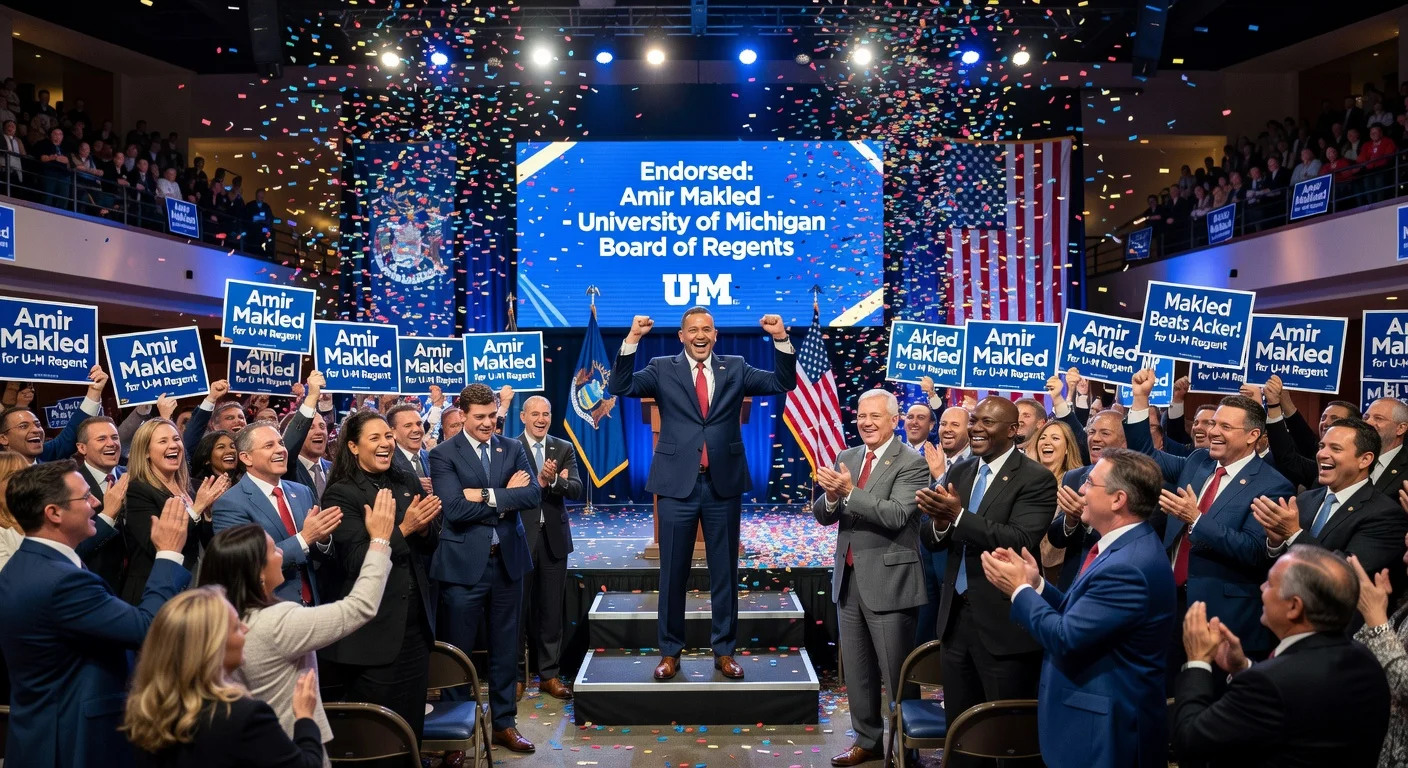 Michigan Democratic Party delegates at the party’s spring endorsement convention in Detroit voted to endorse attorney Amir Makled for the University of Michigan Board of Regents, defeating incumbent Regent Jordan Acker. The party also endorsed incumbent Regent Paul Brown for the second seat on the ticket.
