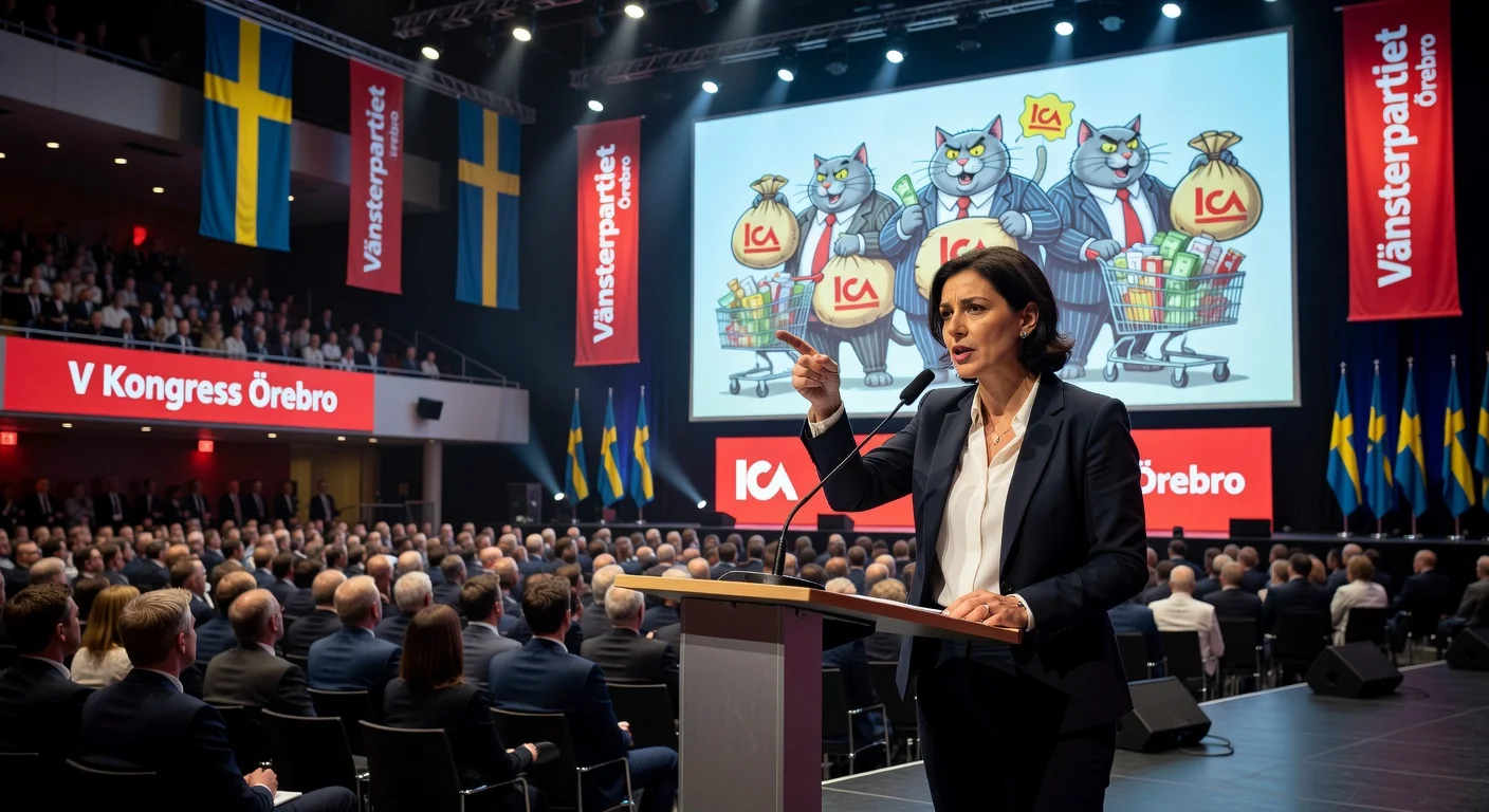 At Vänsterpartiet's congress in Örebro, leader Nooshi Dadgostar attacked food giants, calling them 'fat cats' robbing Swedish households. Ica retailers' chairman Mikael Norling condemns the statement as unfair. Dadgostar also demands Vänsterpartiet join the next government.